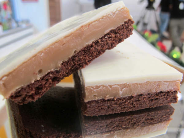 4°- Sobre o caramelo (já frio) coloque um palito de churrasco no sentido da largura dividindo a assadeira em duas partes. Numa parte espalhe 100 g de chocolate branco derretido e na outra parte espalhe 100 g de chocolate meio amargo derretido. Alise a superfície e deixe secar o chocolate (10 minutos). Corte em retângulos de 5 cm X 2,5 cm e sirva em seguida.