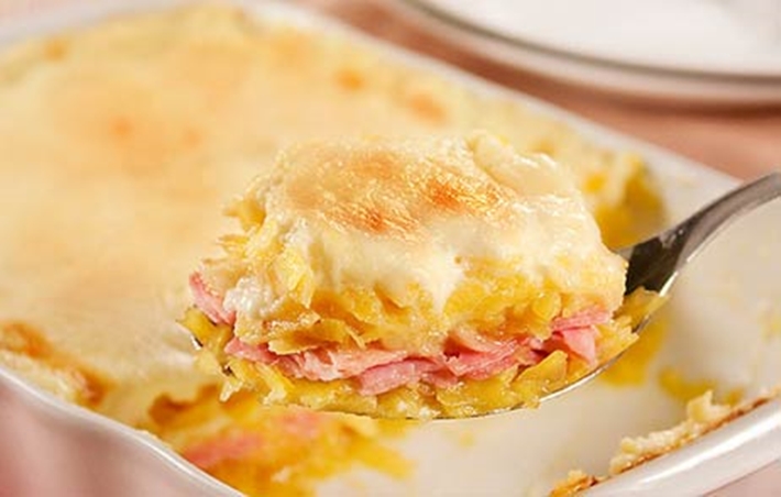 Gratin é uma palavra francesa que significa gratinar, tostar. Normalmente leva creme ou molho branco e queijos para dourar a superfície. Nessa receita, o gratinado leva presunto e mandioquinha, fazendo um prato colorido e nutritivo!