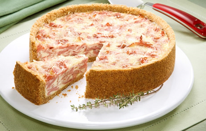Com uma massa feita a base de biscoitos água e sal, essa torta é recheada com o sofisticado queijo gruyère e a aromática e deliciosa Mortadela Defumada.