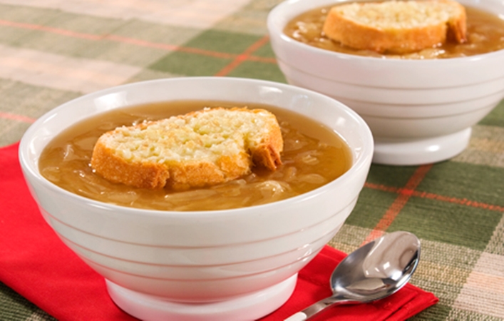- Repita essa operação mais uma vez, complete o refratário com a sopa e gratine por 20 minutos ou até a superfície ficar dourada. Com ajuda de luvas térmicas, retire os refratários do forno e sirva em seguida.