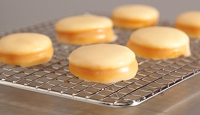 - Com auxílio de uma espátula, espalhe cerca de 1 colher (chá) do doce de leite sobre um disco de massa reservado e cubra com outro disco, formando um sanduíche. Reserve-os.