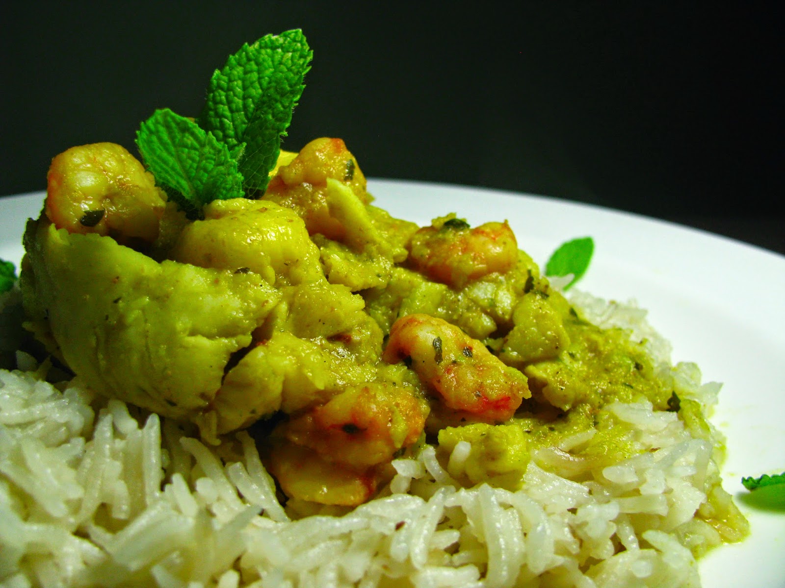 Sirva este caril de pescada com camarão e manga sobre um arroz basmati bem sequinho e decore com algumas folhas de hortelã.