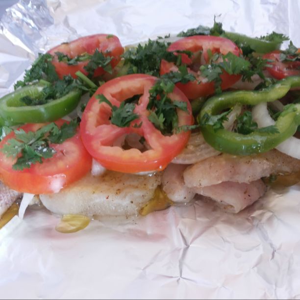Coloque o filé de tilápia no papel alumínio, e faça camadas com a cebola, tomate, pimentão e o coentro (observar a foto enviada). Em seguida, regue com azeite extra virgem e embrulhe o filé no papel alumínio até que forme um pacotinho. (Lembre-se de embrulhá-lo bem para que não abra enquanto assa, e assim, azeite não escorra.)