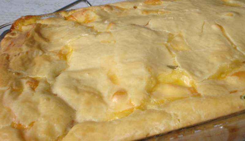 Coloque metade da massa em uma forma untada, espalhe o recheio de frango, uma cada de presunto e outra de mussarela e o restante da massa