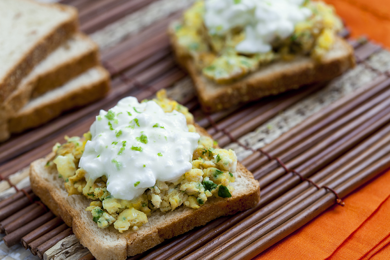 Coloque um pouco do ovo mexido sobre cada uma das torradas. Por cima, acrescente uma colher (sobremesa) de queijo cottage e salpique as raspas de laranja.