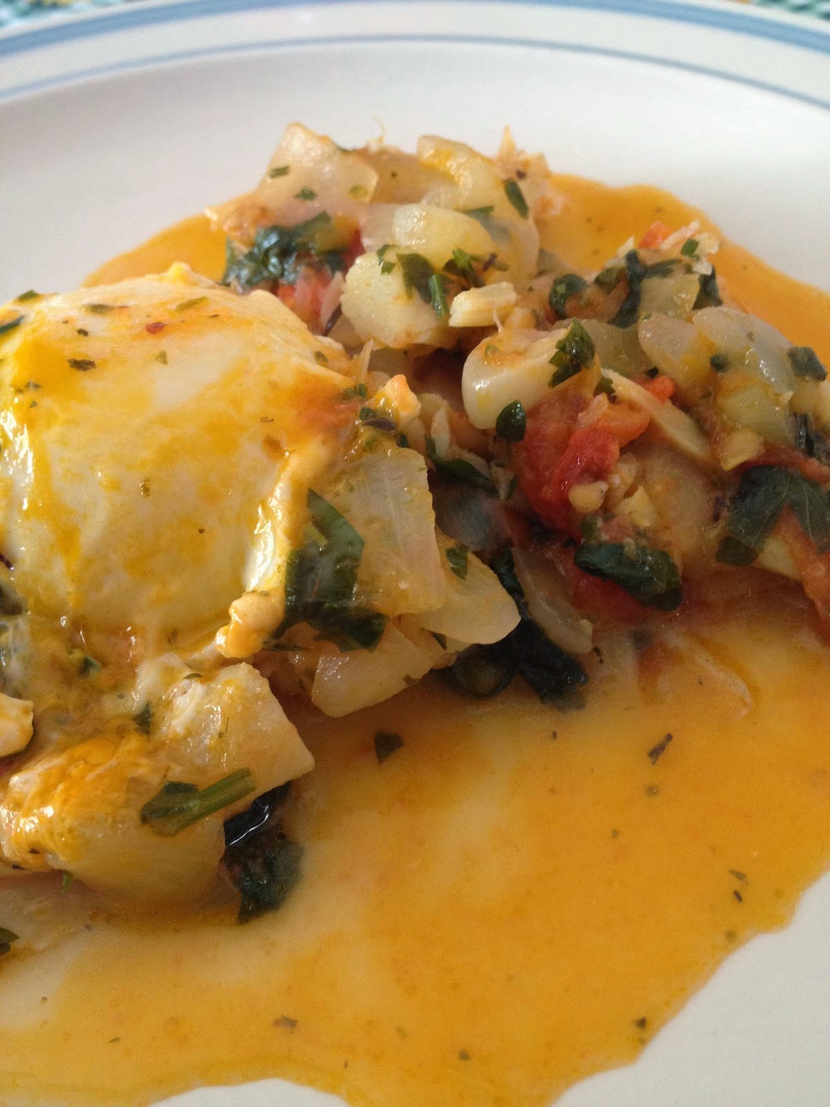 Picar a salsa e os coentros e acrescentar ao preparado anterior. Partir os ovos para escalfar, e deixar uns minutos.