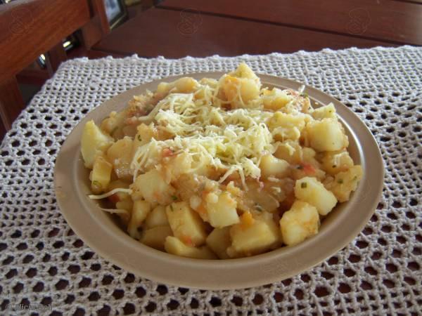 Polvilhe queijo ralado por cima das batatas deixe derreter um pouco retire e é só servir