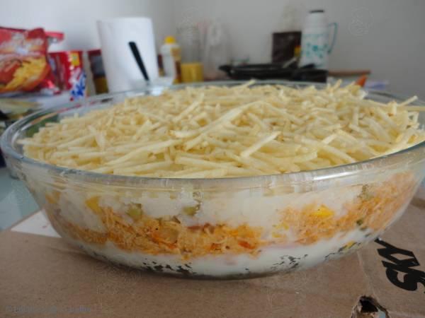 Sobre as camadas prontas, espalhar a batata palha e o queijo ralado