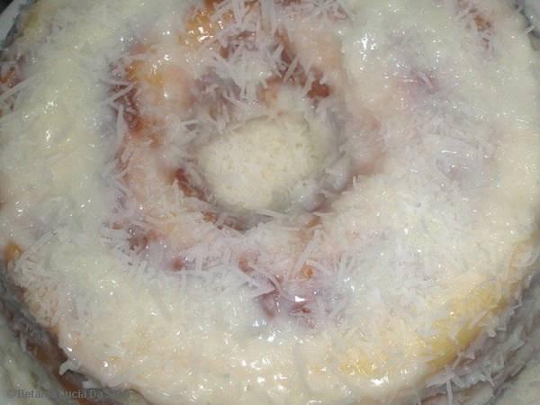 Unte uma forma média, coloque a massa e leve ao forno pré-aquecido por uns 40 minutos, ou até dourar