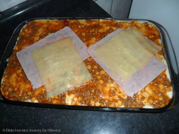Arrume direitinho e coloque mais molho bolonhesa, queijo, presunto e o molho branco