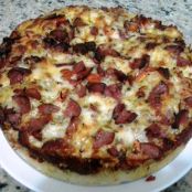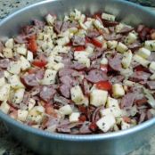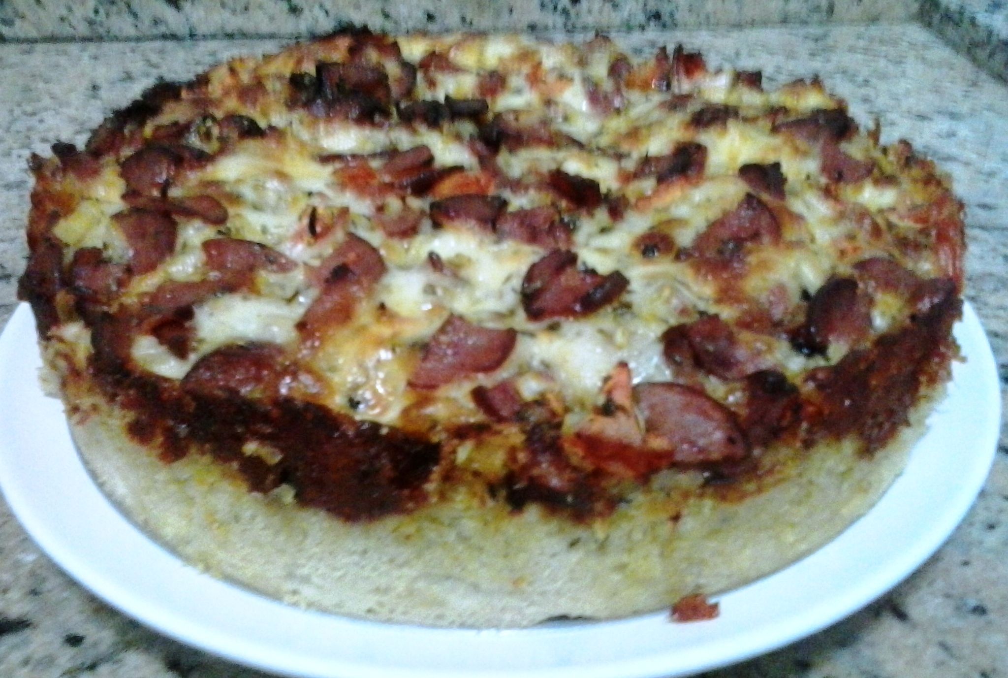 Numa tigela coloque a calabresa em cubos, o bacon frito, os tomates picadinhos, o orégano e a mussarela em cubos.