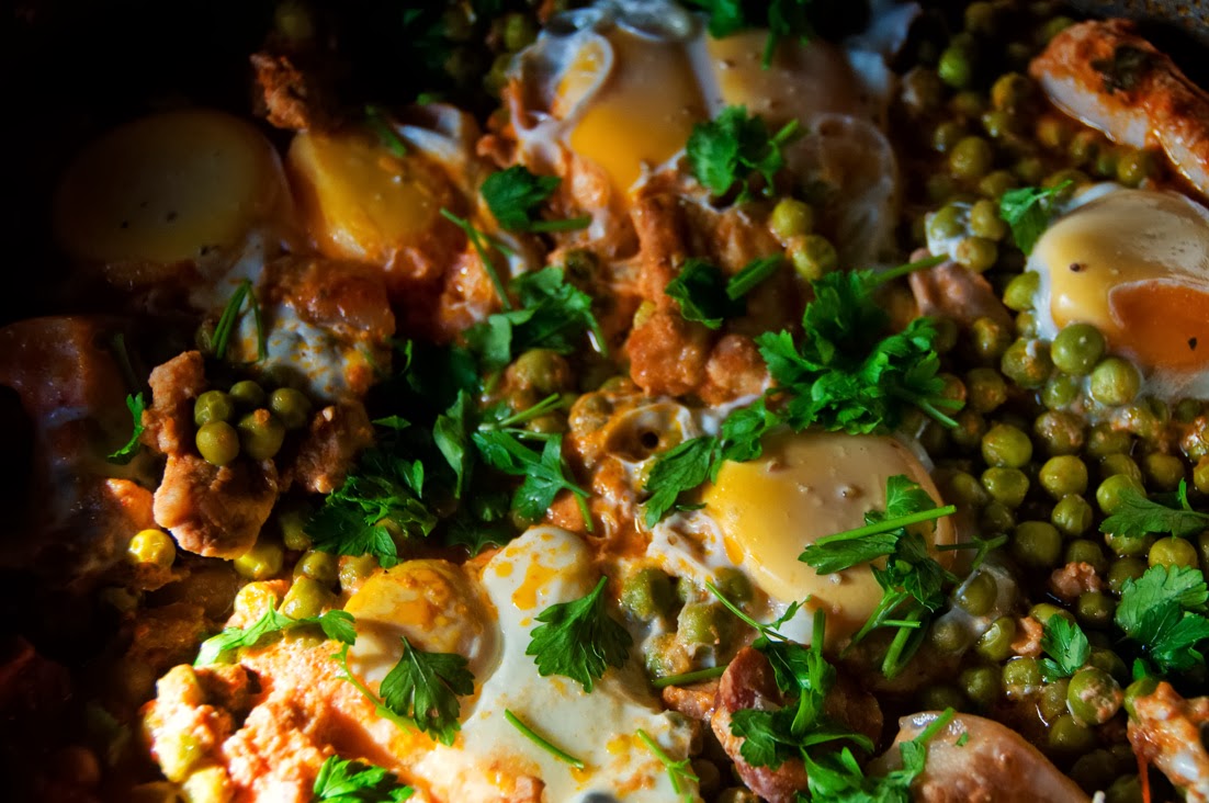 Agora as ervilhas, yeah! Põe as ervilhas num coador e passa-as por água quente. Junta ao tacho as ervilhas,o tomate, a malagueta e 2 colheres de salsa, e dá uma mexidela. Tempera com sal e pimenta (sem exageros, que os enchidos são salgaditos, e menos ainda se usares a malagueta). Junta os líquidos, tapa e deixa cozinhar em lume brando cerca de 40 minutos. Vai mexendo tempo a tempo, e prova as ervilhas. Se ainda não estiverem tenras, mantém ao lume mais um pouco.
