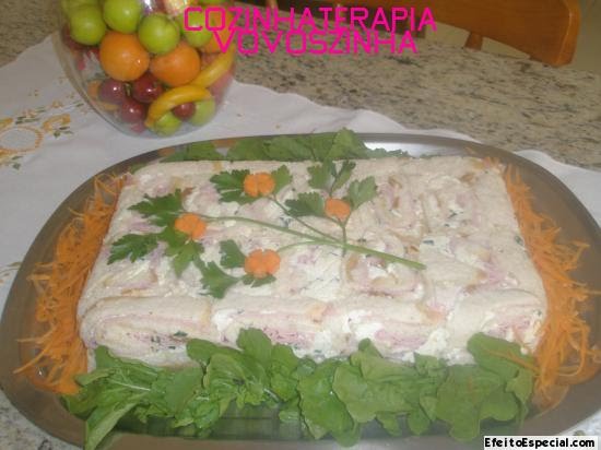 - colocar metade do creme,por cima dos rolinhos que já estão no pirex por cima do creme colocar uma camada de muçarella e cobrir com uma camada de fatias de pão de forma,colocar o resto do creme outra camada de muçarella e o resto das fatias de pão.cobrir com papel filme e levar a geladeira para firmar.
