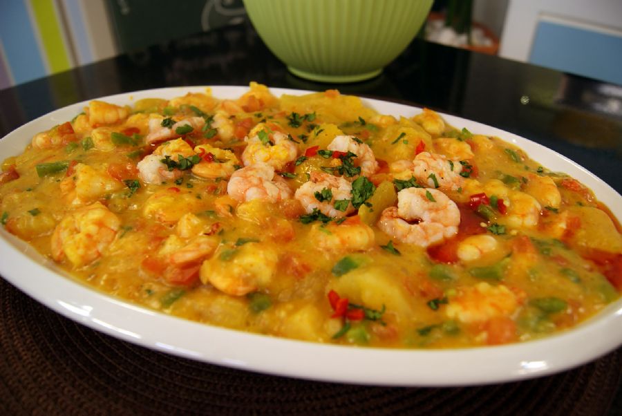 Molho: em uma panela, aqueça o azeite e o óleo de dendê. Acrescente o alho, a cebola e deixe refogar. Adicione a mandioca, o leite de coco e misture. Coloque o tomate, a pimenta, a cebolinha o coentro e a salsa, misture bem. Acrescente o camarão misture e coloque o caldo de peixe aos poucos de acordo com a textura que deseja atingir.