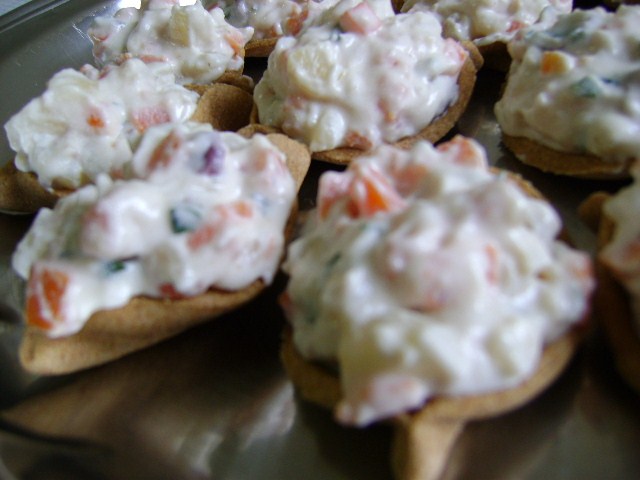 - 4 batatas cozidas e picadas 2 cenouras cozidas e picadas 1 tomate maduro sem sementes picado azeitonas a gosto cheiro verde a gosto sal a gosto 1/2 maçã sem casca picada 2 ovos cozidos picados 1 vidro pequeno de maionese 20 barquinhas compradas prontas