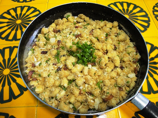 Quando estiverem bem douradinhas coloque a farinha de mandioca, e mexa por 1 minuto, coloque a margarina e mexa por mais dois minutos.