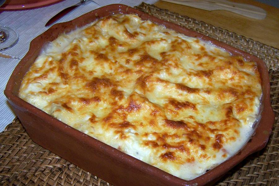 Numa assadeira ou refratário, coloque molho branco, uma camada e massa de lasanha, muçarella, provolone, parmesão e molho branco.