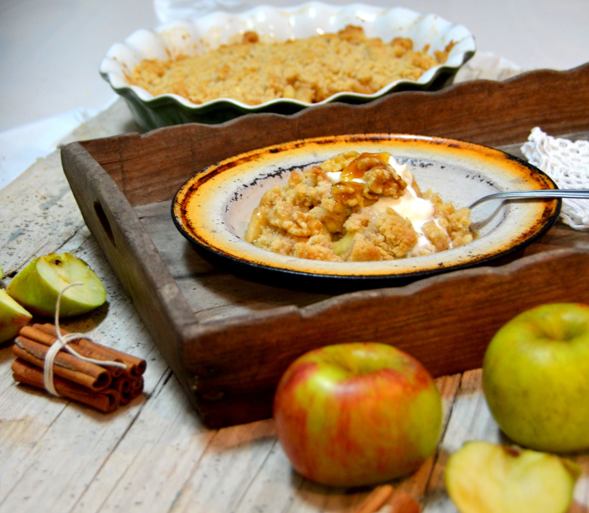 Num recipiente, coloque a manteiga juntamente com o açúcar branco, a farinha e a canela e amasse com as duas mãos até obter uma mistura esfarelada. Reserve;