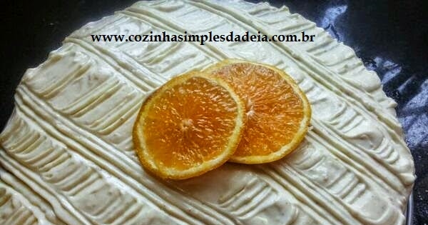 Corte o bolo ao meio, coloque metade da mousse no meio do bolo, e a outra metade por cima. Espalhe com uma espatula e faça riscos com um garfo. Decore com rodela de laranja. Se desejar, utilize um saco de confeitar e decore á seu gosto.