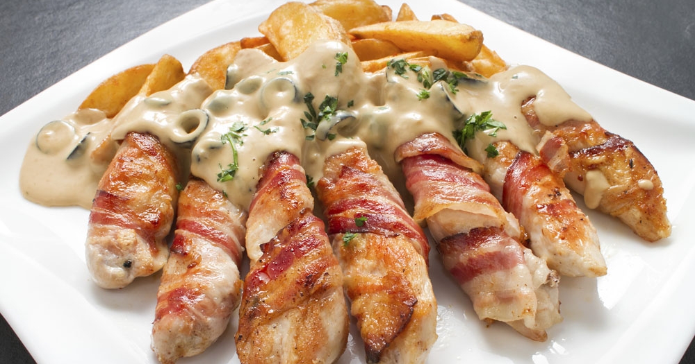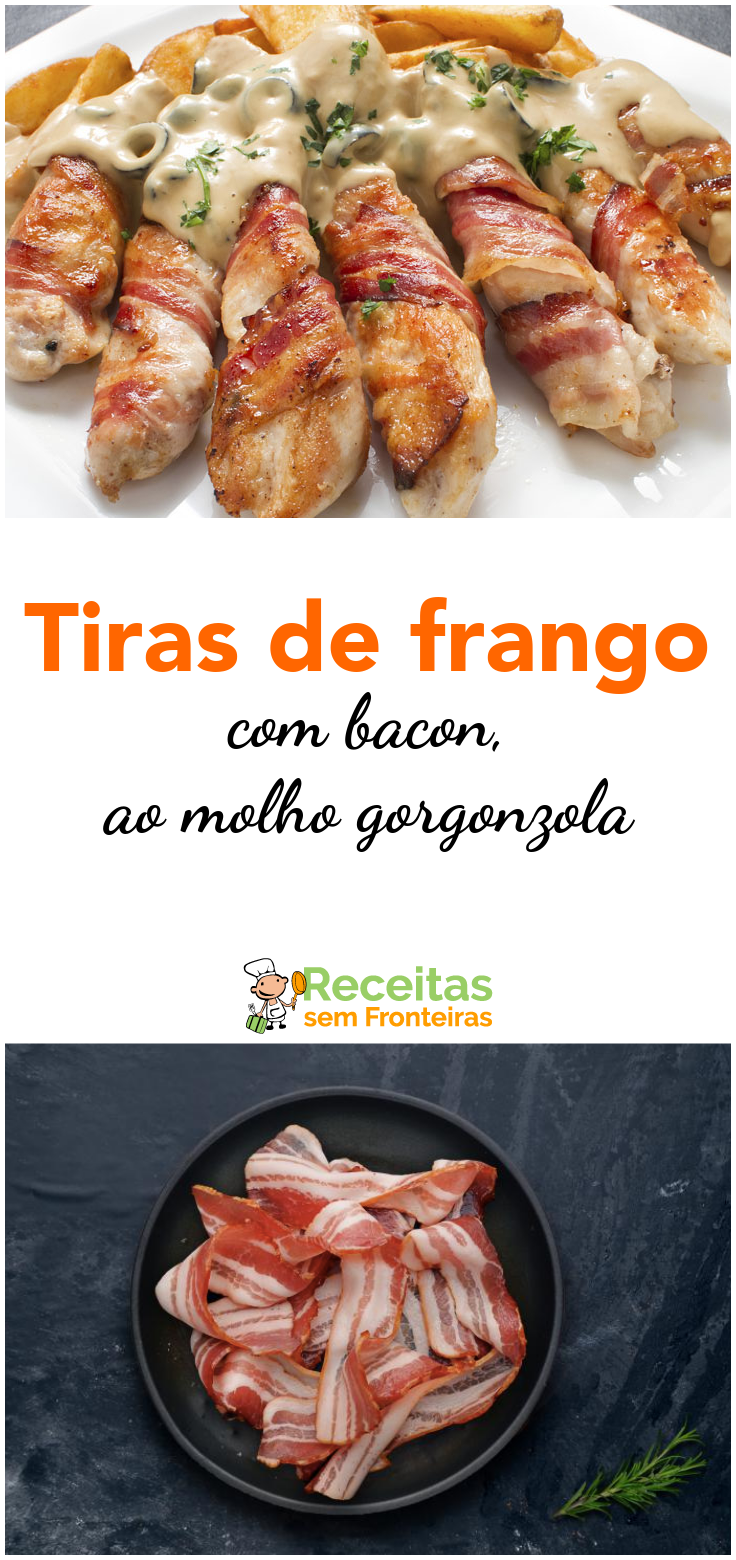 Tiras de peito de frango enroladas em bacon com delicioso molho gorgonzola! Imperdível!