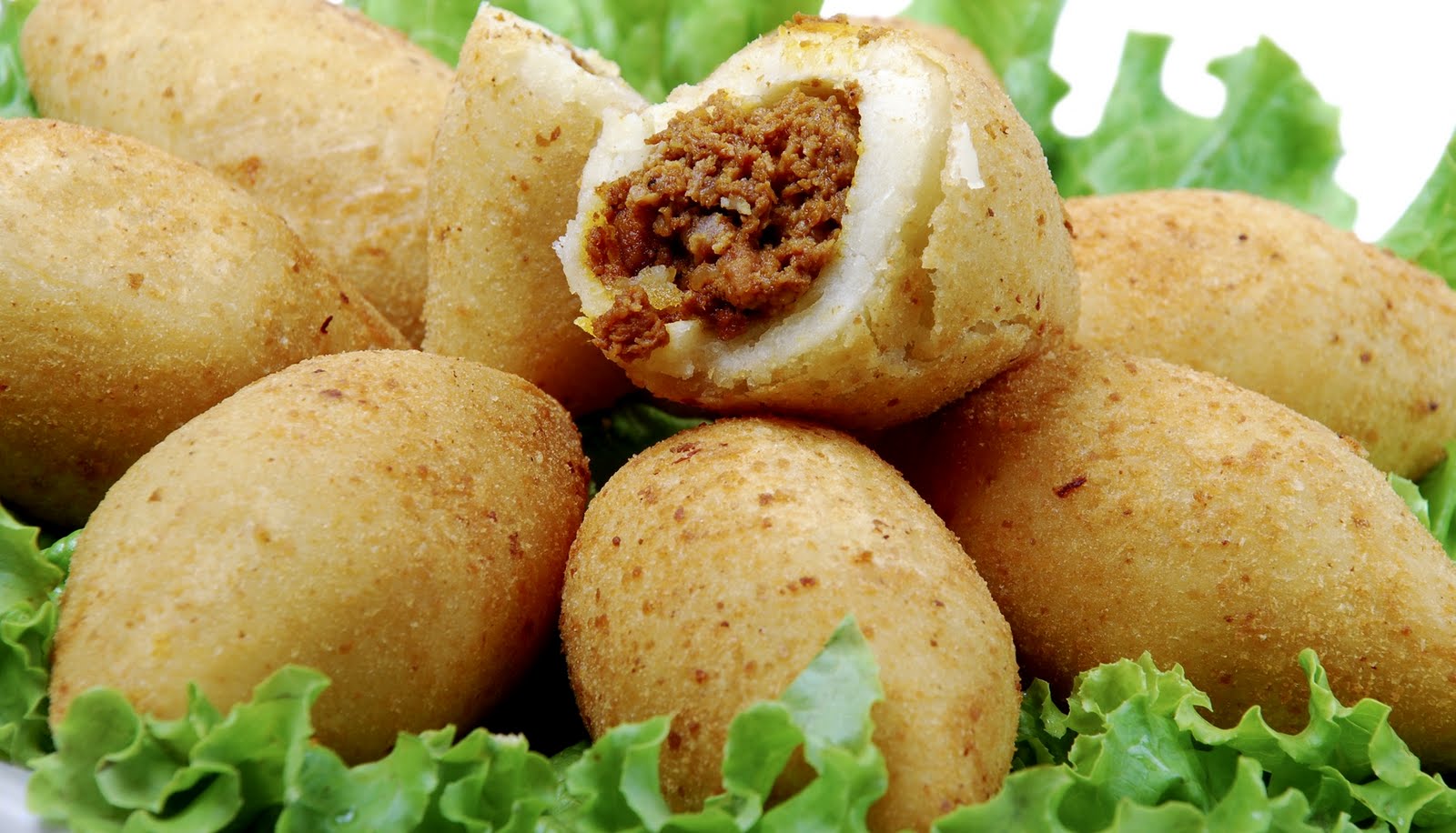 * Misture a mandioca amassada com a carne refogada e amasse bem, umedeça as mãos com água e modele os bolinhos, passe-os na farinha de rosca.