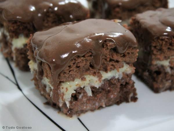 Em um recipiente misture o açúcar, o trigo, o fermento, o chocolate e o coco ralado a gosto