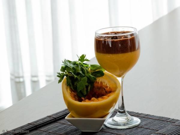 Faça camadas com os dois mousses, enfeite com sementes de maracujá ou raspas de chocolate, sirva gelado