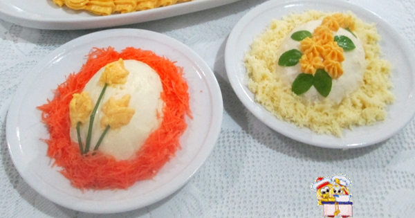 Os arremates da base tanto dos ovos pequenos, quanto do maior podem ser, além do cordão de conchinhas feito com a massa de queijo, cenoura crua ralada, beterraba crua ralada, queijo ralado, batata palha, couve crua raladinha, enfim, solte a imaginação.