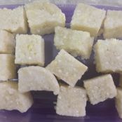 Quando retirei o refratário da geladeira, cortei a massa em quadradinhos, pode ser do tamanho que você preferir, eu gosto mais quando eles são menores.