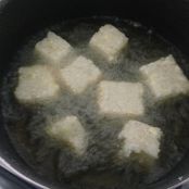 Depois de cortar a massa todinha, coloquei os dadinhos para fritar. Mas se liga aí que o óleo tem que estar beeeeeeeeem quente, ok?