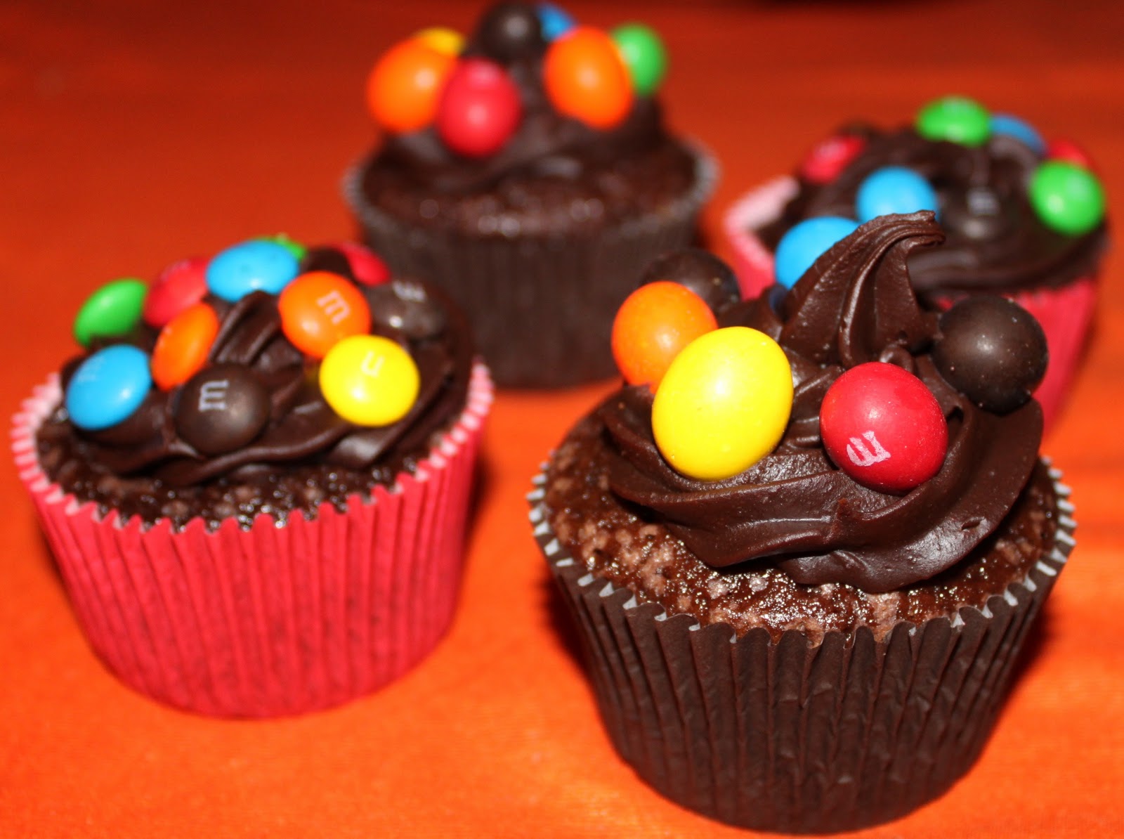 Depois é só esperar os cupcakes esfriarem para passar a cobertura de brigadeiro por cima e cobrir com os M&M's.