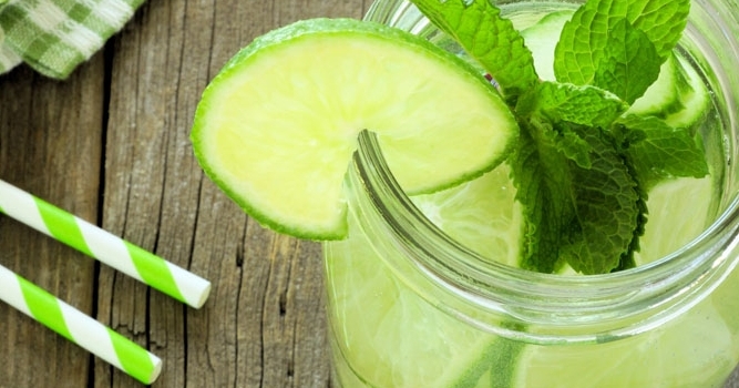 Lave as frutas e legumes. Corte o limão e pepino com a pele em fatias. Coloque-os em seu recipiente.