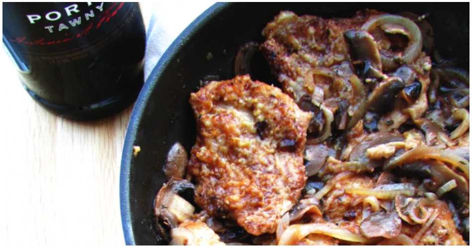 Na mesma frigideira, junte os cogumelos e deixe fritar um pouco. Acrescente a cebola cortada às rodelas, o alho laminado, o Vinho do Porto, a água, o caldo Knorr e o tomilho e deixe cozinhar, até a cebola estar macia (cerca de 7 minutos).