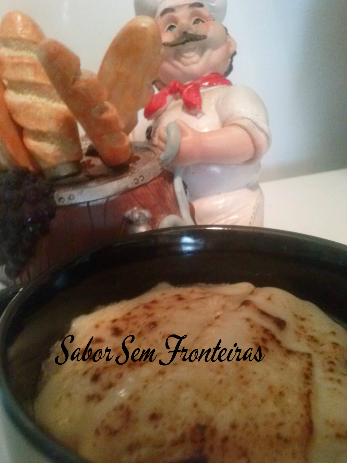 Após o tempo de fervura, coloque no fundo de uma cocote ou consume a fatia do pão, despeje a sopa e cubra com o queijo. Deixe gratinar por cerca de 15 minutos.