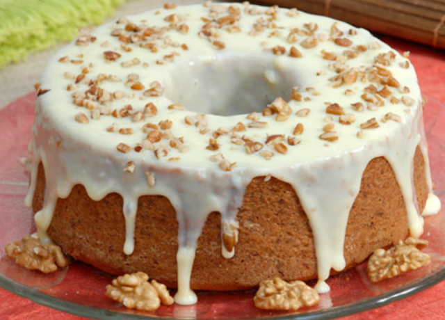 Bata tudo até ficar esbranquiçado, e jogue sobre o bolo quente