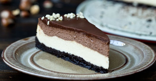 Um cheesecake com duas camadas, uma de baunilha e outra de Nutella sobre um leito de biscoito OREO e coberta com um ganache de Nutella. Precisa mais?!