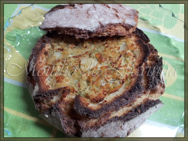 Numa frigideira colocas o azeite, a cebola e os dentes de alho e deixas alourar. Juntas o bacalhau previamente cozido e temperas com pimenta, sal e salsa. Deixas refogar um pouco e juntas o miolo da broa para envolver bem no azeite. Enches a broa com esse preparado, colocas a tampa e levas ao forno. Passados 15 minutos (aprox.) retiras a tampa da broa e deixas no forno até dourar.