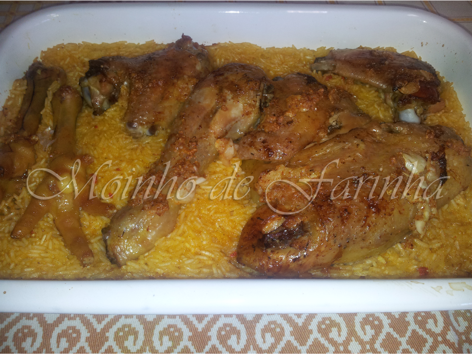 Depois de tudo cozinhado, retira o frango do tabuleiro, despeja o arroz nesse tabuleiro e coloca o frango em cima do arroz com a pele virada para cima. Leva ao forno a dourar.