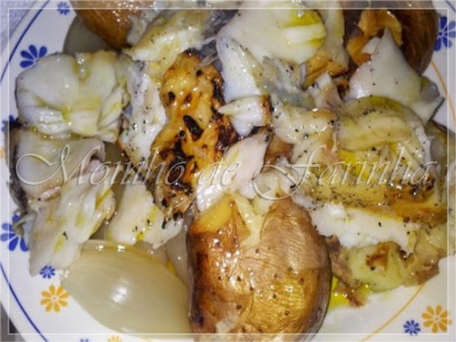 Depois de a batata estar assada, retirar o excesso de sal e trasnferir para outro tabuleiro, apertando a cada batata até "estalar", ou dando um murro (batata a murro)! Lascar o bacalhau assado por cima das batatas. Usar dentes de alho a gosto (eu gosto muito do gosto que o alho dá, por isso uso 3 ou 4 dentes). Regar bem com azeite. Servir acompanhado com azeitonas e broa.