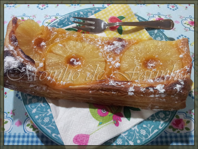 Estende a massa folhada num tabuleiro forrado com uma folha de papel vegetal (podes usar a folha que vem com a massa folhada) e barras com o creme de pasteleiro. Dispões as rodelas de ananás por cima e levas ao forno pré-aquecido a 200°C durante 30 minutos (aprox.). Após esse tempo, retiras do forno, deixas arrefecer um pouco e polvilhas com açucar em pó. Está pronto a servir...