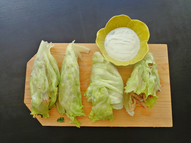 Na folha de alface, colocamos um pouco do molho, em seguida a cebola, o tomate, o frango, mais um pouco de molho, os coentros e cuidadosamente enrolamos.