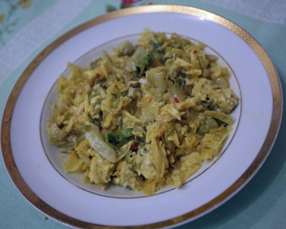 Não tinha muita coisa lá em casa. Tinha um resto de alface, um resto de batatas fritas de pacote já todas partidas mas ainda crocantes, que tinham sobrado da companhia dum frango no churrasco, há um mês atrás. Quanto à alface? Em Portugal não se cozinha muito. Há quem a ponha na sopa e também há quem faça um chá para acalmar os nervos. Nem uma coisa nem outra! Fiz como em Macau, estufei-a na frigideira. Como também tinha ovos resolvi misturar tudo. E ficou bom!