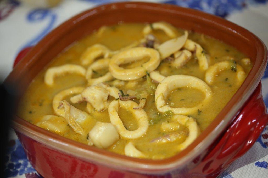 Desfaça tudo com a varinha e junte as lulas. Leve novamente ao lume.