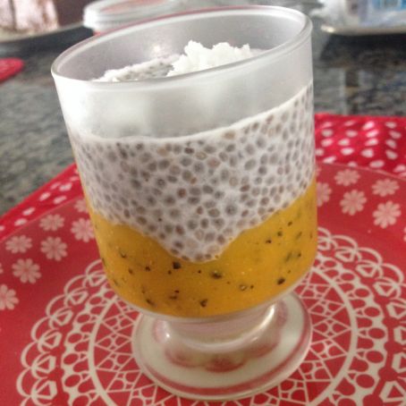 Em um recipiente misture o leite de coco com a chia e reserve por dez minutos. Depois misture novamente e leve a geladeira de um dia para o outro para que adquira a consistência, ou então faça pela manhã para montar a noite.Bata no processador ou liquidificador 01 manga Tommy ou a que preferir em pedaços com o suco concentrado de 01 maracujá ou pode bater com a polpa mesmo do maracujá, e a aveia até ficar homogêneo, como um creme. Caso você bata a polpa do maracujá, ficará uns carocinhos mas não tem problema.