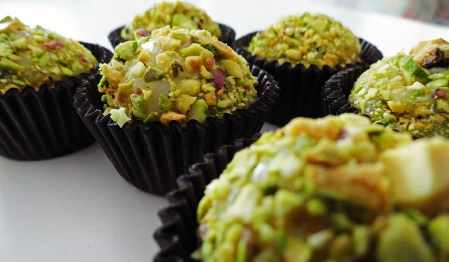 Para empanar, untar as mãos com manteiga , fazer bolinhas e passar no pistache, colocando em forminhas logo em seguida.