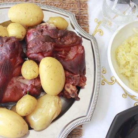 Temperar o joelho de porco de véspera com suco de 2 limões, 3 dentes de alho amassados, 2 cebolas raladas, uma pitada de pimenta do reino, e duas colheres de óleo, 1 colher de chá de orégano, um galho pequeno de alecrim fresco, sal a gosto.