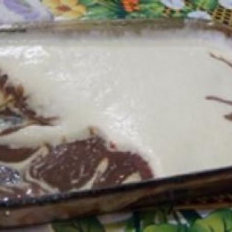 Despeje em um pirex a massa branca , depois a massa de chocolate .