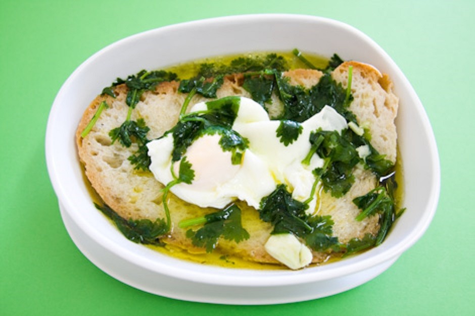 No fundo de cada prato de sopa, colocar uma fatia de pão e o ovo.