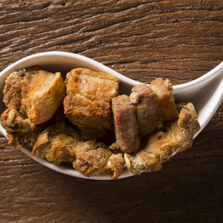 Pique a barriga em pedaços pequenos e tempere com sal, pimenta e coloque a cachaça que vai ajudar a pele a pururucar.