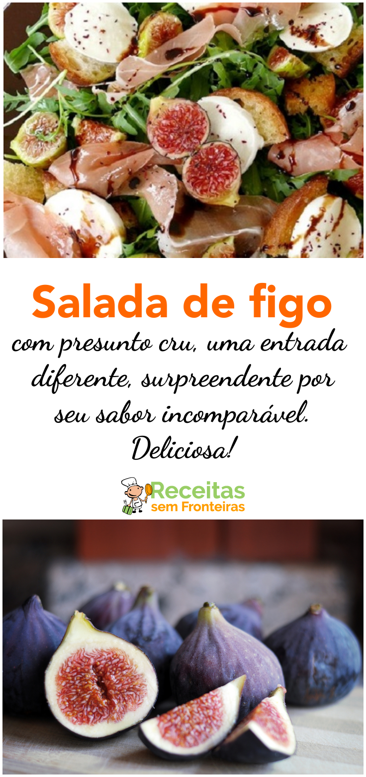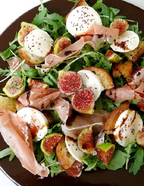 Em um prato de cerâmica, coloque os figos espalhados, a rúcula no centro e o presunto perto do figo